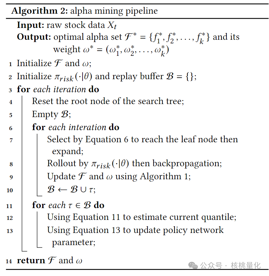 整个训练流程中,MCTS和策略优化相互交替进行,以挖掘最优的alpha值。从MCTS中采样的轨迹作为训练数据用于训练风险追求策略网络。训练得到的策略网络将在MCTS的选择和展开过程中使用。简而言之,MCTS充当了与环境交互的采样器,而策略优化则作为一个优化器,通过使用采样轨迹来训练MCTS采样器的风险追求策略。整个算法的伪代码如下: