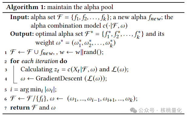 在模型训练过程中,我们使用均方误差(MSE)作为损失函数,衡量综合alpha和未来股票收益之间的差距。通过使用梯度下降来最小化损失,我们得到了当前alpha集合F的最优权重𝜔。池的大小𝐾是预先设定的。新的alpha将逐步添加到池中。当新的alpha被添加到池中时,执行梯度下降来更新𝑘 +1个alpha的权重。如果alpha因子的数量达到了阈值𝐾,则从池中移除权重绝对值最小的主要alpha。算法的伪代码如算法1所示。