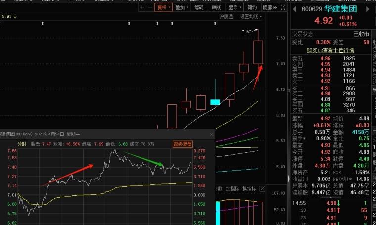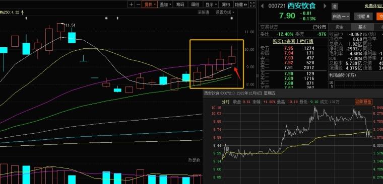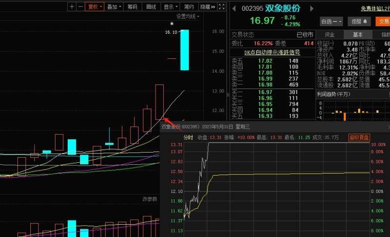 在一个涨停之后,连续四个交易日的K线全部带上引线,日内分时冲高回落,日内的最高点均超过 8%,其中有二个交易日是涨停破板,细节是回落的位置越来越高,犹如向上的台阶一样,这就是主力在用上引手法不断地洗筹,如果你看懂了,不会因为破板认为走弱了,没有机会了而不知所措,或过早取关弃之。要知道大肉段还在后面。
