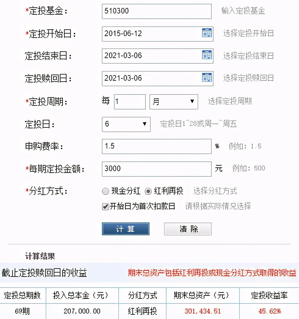 总共投入了20.7万元本金,时至今日基金价值为30.14万元,定投的收益率是45.62%!前提是5178点开始投入,算取收益时沪指只有3500点。