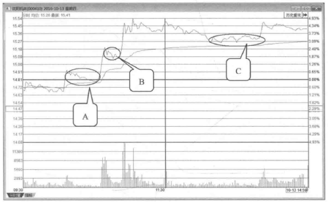 B处经充分调整后,价格再度放量急拉,三波上涨结束后,价格在高位震荡,随后价格出现了回调,这一波回调的时间较长,但价格始终在均价线上方。由于这一波回调是缩量的,所以仍可以看涨,即图中C处。