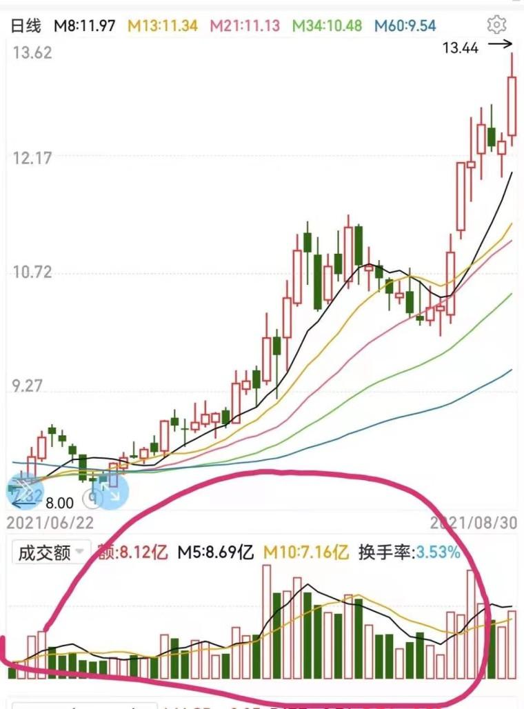 1.低位启动前的量价关系如果一波行情要启动,这个阶段主力肯定要慢慢洗盘吸筹积累,拿到更多便宜的筹码,这个启动前的阶段量价关系很简单,通常量能温和相对较低,价格在底部震荡,成交也不活跃,多空力量均衡,这就是我们常说的磨底,是要比较谁更有耐心。当哪天量能缩小到极致后量能开始慢慢释放,价格还是波动不大,依旧还是底部还未突破。这个时候价格涨幅不明显,量能变大,说明有人在吸筹,同时又不想让人看出来异常,这就是底部阶段的价平量增,如果你想潜伏,这个时候可以入手了。