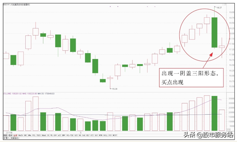 步骤 1 图所示为兴发集团(600141)的走势图。从图中可以看出,股价前期经历了一波上涨行情,至5月底出现一阴盖三阳形态,买入信号出现,投资者可以在大阴线的底部买入。