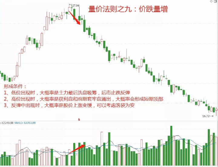 3、量增价跌还会跌,也称之为放量下跌,一只股票在高位转向下跌趋势中,成交量有所增加但是股价却随着下跌,即便有反弹,也很难超过上一个放量的区域,局势难以更改,还将会继续下跌,K线当天的实体通常会比较大,代表着空方的意愿非常强,已经不在乎股价了,一旦方向转为下跌趋势,及时准备好离场的动作,不要留念!