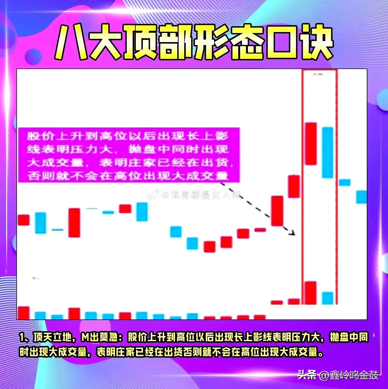 你是否在买一只股票,进场点位抓得非常精准,在一段时间之后已经赚取到了不错的利润,如果你没有好的卖点,可能在这一波上涨赚取利润都会被吐回去,甚至还会损失到本金。所以有句老话说得好,会买的是徒弟,会卖的才是师傅。欧阳整理了八大顶部模型,配上口诀和图形,非常简单易懂,尤其适合新股民,供收藏研究!
