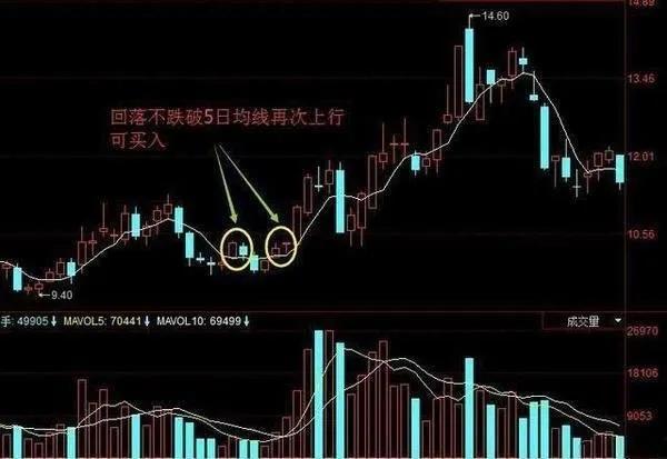 当股价回落且跌不破5日均线的时候,再次启动时就是买入的机会;而慢牛股在上升途中,通常大多数的时间会不跌破5日均线,只要不跌破,就可以结合大势、结合个股基本面,继续持仓。图解如下: